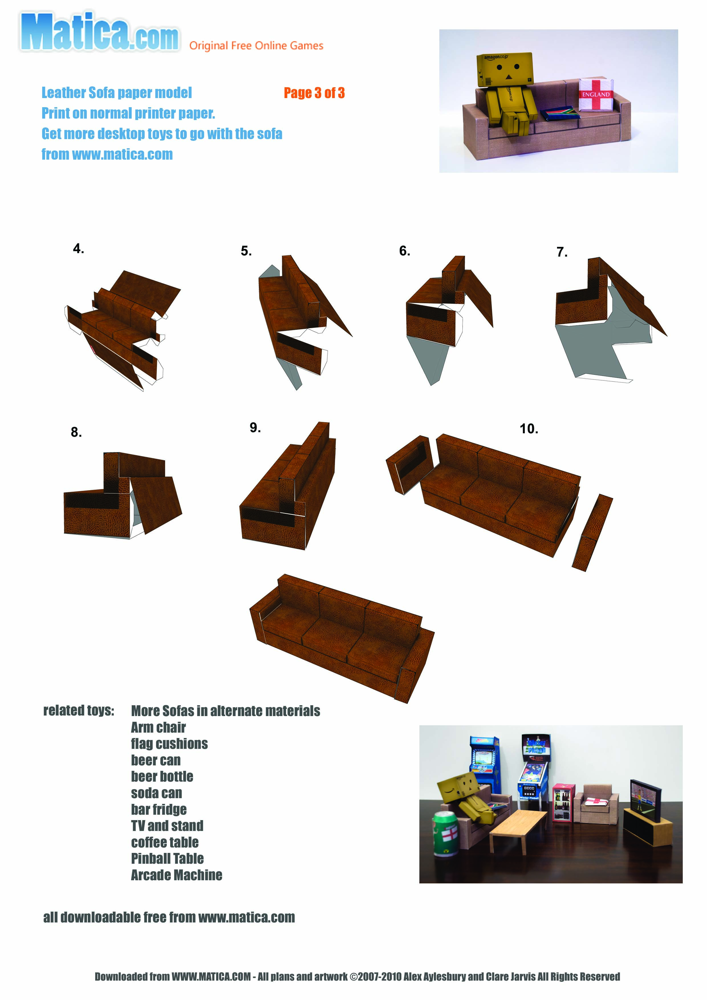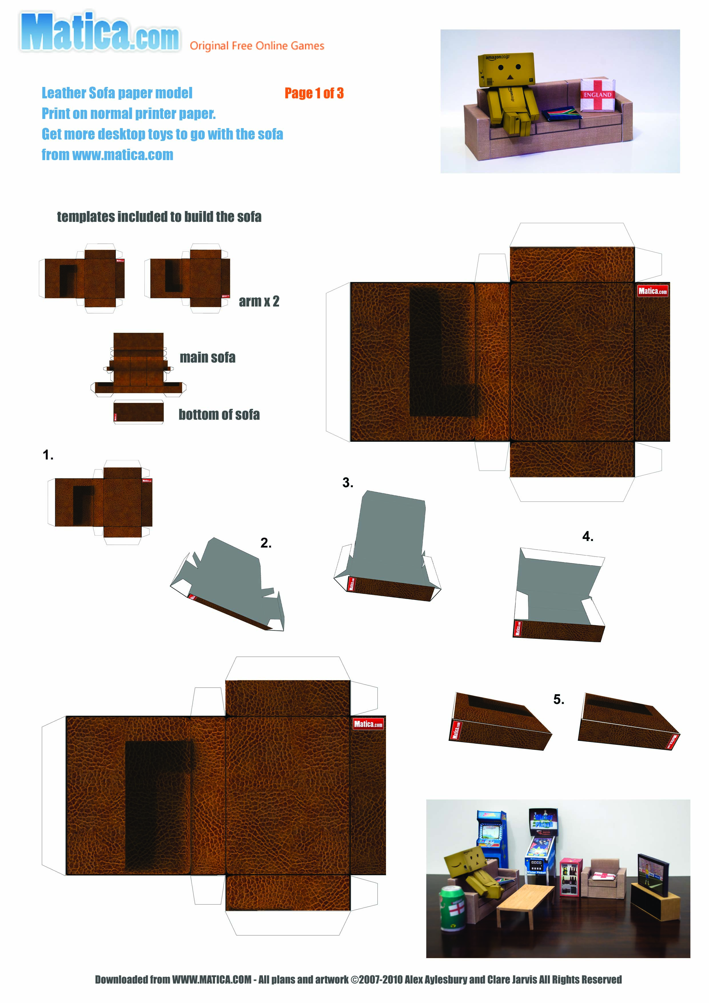 This particular model is of a typical brown leather and is a must have for anybody who likes their desktop paper toys. Download the flag cushions to accompany the arm chair and leather sofa. Available to download for free are a number of different bar fridges, TV and cabinet, coffee table and many more models to kit out your desk.